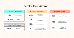 Jatah lainnya, Scroll mengalokasikan hampir 7 juta SCR untuk proyek-proyek kripto yang dibangun di atas blockchain mereka. Lebih dari 100 proyek akan menerima airdrop berdasarkan Total Value Locked (TVL) protokol. Sisanya, lebih dari 1 juta SCR didistribusikan kepada kontributor kode open-source, peneliti ZK, dan firma analitik yang berkontribusi pada proyek-proyek publik seperti DefiLlama, L2Beat, dan GrowThePie.