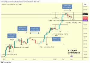 Titik atau area bottom yang ditentukan Rekt Capital sendiri ada di kisaran $60.600 dalam weekly range. Menurutnya, Bitcoin saat ini masih ada di zona bahaya siklus pasca halving. Bila berkaca pada sejarah 2016, zona bahaya tersebut berlangsung selama 21 hari dan akan ‘secara resmi’ berakhir pada 13 Mei bila tren 2024 mereplikasi total chart 2016.