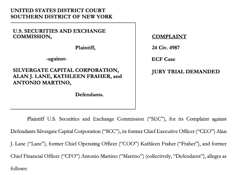 Selain menggugat Silvergate Capital Corporation, SEC juga menuntut mantan CEO Silvergate Alan Lane, eks COO Silvergate Kathleen Fraher, dan eks CFO Silvergate Antonio Martino. Masing-masing dari mereka dituduh melakukan pelanggaran undang-undang sekuritas.