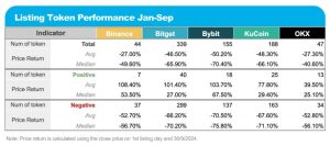 Bybit menjadi bursa dengan performa terburuk dalam performa harga token yang baru listing. Bursa ini mencatatkan rata-rata penurunan harga sebesar 50,2% dan median hingga 70,4%. KuCoin mengikuti dengan median 66,1%. Selanjutnya ada Bitget yang menjadi bursa yang melisting token anyar paling banyak, dengan rata-rata penurunan harga 46,5%.