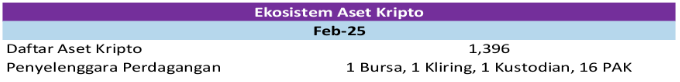 Hingga akhir Februari 2025, terdapat 1.396 aset kripto yang dapat diperdagangkan di Indonesia. OJK telah memberikan izin kepada 19 entitas yang beroperasi dalam ekosistem perdagangan aset kripto.