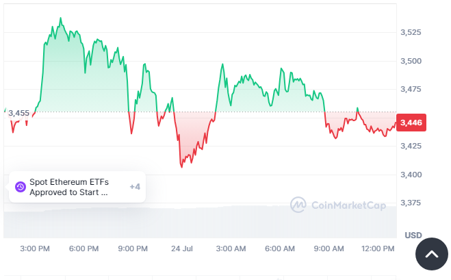 Meski demikian, harga aset digital terbesar kedua berdasarkan kapitalisasi pasarnya ini belum mengalami perubahan signifikan. Data CoinMarketCap menunjukkan, ETH saat ini diperdagangkan di harga $3.443, turun 0,17% dalam 24 jam terakhir.