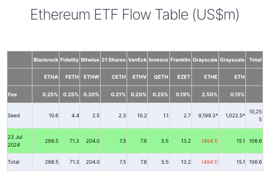Data FarSide menunjukkan, total inflow di hari pertama perdagangan ETF ETH spot mencapai $106.6 juta. Jika outflow Grayscale tak dihitung, maka inflow total ETH Ethereum bisa mencapai $590 juta.