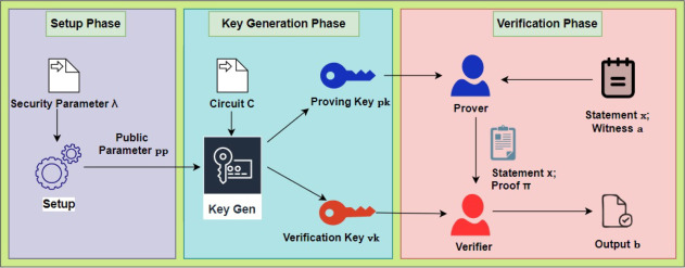Sistem pembuktian zk-SNARK berjalan melalui tiga tahap utama:
